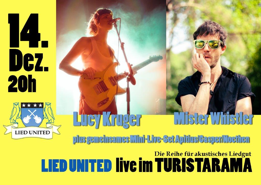 Eigens für die Dezember-Ausgabe der Kölner Konzertreihe Lied United wird die aus Südafrika stammende und in Berlin lebende Musikerin Lucy Kruger ein exklusives Set als Duo darbieten. Lucy Kruger und ihre Band The Lost Boys sind in Deutschland und auch international keine Unbekannten. Im Zuge ihrer nunmehr vier veröffentlichten Alben waren sie auf diversen renommierten Festivals wie dem Wave-Gotik-Treffen, dem Reeperbahn-Festival oder dem Maifeld Derby zu bestaunen. Dabei bewegt sich die Musik der Art-Pop-Psychedelic-Rockband von anmutigen Balladen und intensiven zärtlich-sphärischen Songs bis zu lauteren Angst-Arangements. Nun wird sie dieses gesamte Songmaterial exklusiv für Lied United in abgespeckter Form als Duo mit ihrem Gitarristen Liú Mottes neu erfinden. Dieses mehr als sehenswerte Ereignis wird wie üblich ebenso von Wolfgang A. Noethen in seiner ganz eigenen Art moderiert wie das zuvor zu bestaunende Programm des Abends.